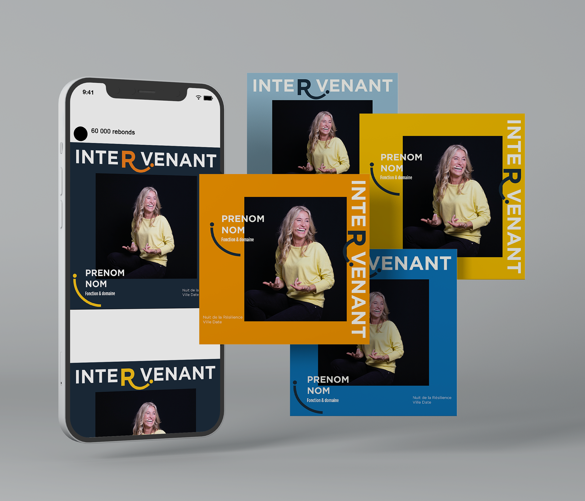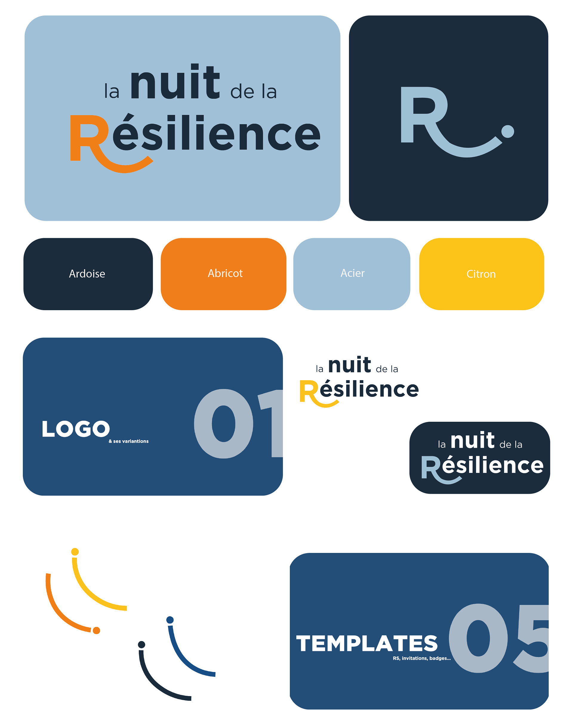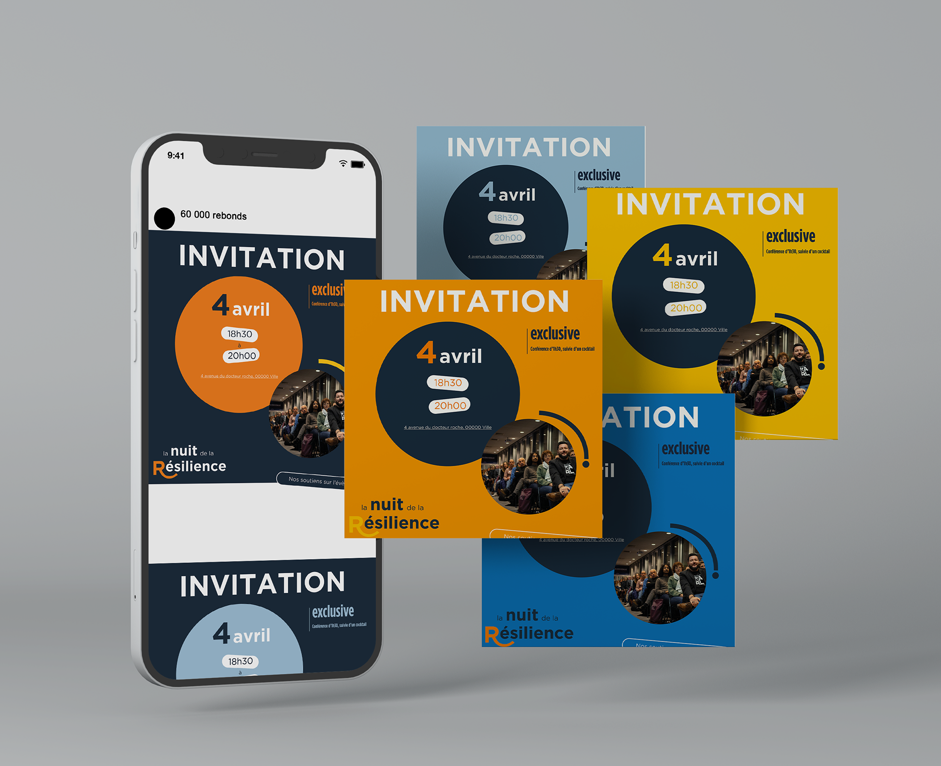 Durant mon alternance chez 60 000 rebonds, j'ai mené le projet de la création de l'identité visuelle de l'évènement Nuit de la Résilience. 60 000 rebonds aide et accompagne les entrepreneurs lorsqu'ils ont fermé leur entreprise. Cette association prône le changement de regard sur l'échec en France, qui n'est pas encore démocratisé. Ces Nuits de la Résilience sont là pour changer le regard sur l'échec. Différents speakers sont invités aux côtés d'entrepreneurs ayant été accompagné par l'association, afin de témoigner de leurs échecs & résilience sur tous les domaines : le sport, la psychologie de l'échec... Cette soirée à pour but d'inspirer les personnes et de les aider à voir l'échec d'une manière plus positive.